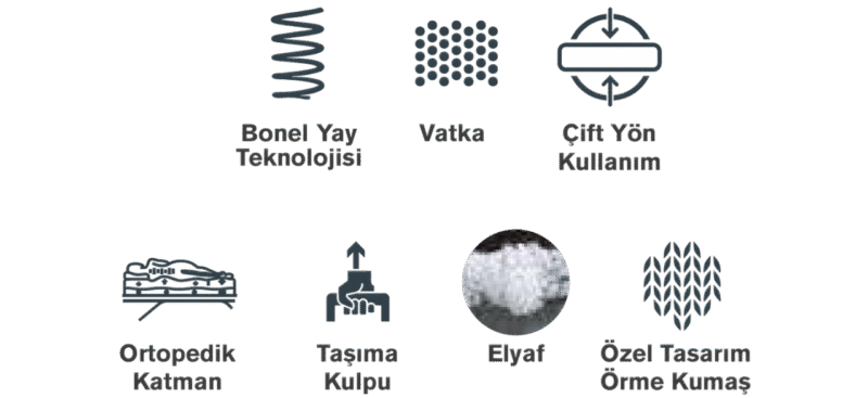Özel Sevyat örme kumaşı, 2,38 mm güçlendirilmiş Bonel yay sistemi ve çift taraflı kullanım avantajıyla, 26 cm yükseklikte formunu uzun yıllar koruyan ekonomik ve dengeli bir uyku sunar.