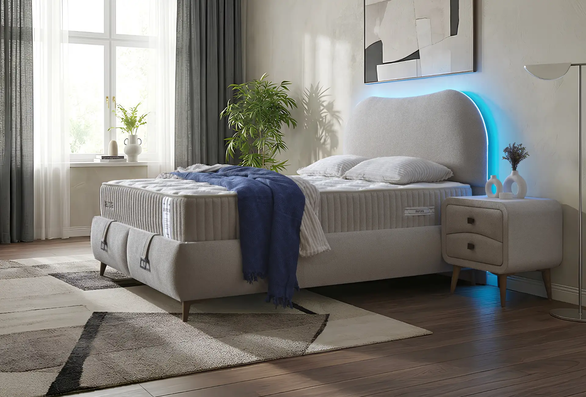 Uykunun sihirli atmosferinde her geceyi daha özel kılın. Zarif ve fonksiyonel tasarımı ile yatak odanızı birinci sınıf bir dinlenme alanına dönüştürüyor. Saf ve şık tasarımı ile yaşam alanlarınızı sakinleştirici bir görsel deneyime dönüştürüyor. Mavi led aydınlatması ile geceleri uyurken veya dinlenirken hoş bir ortam oluşturur. Şimdi yatak odanızı ve uykunuzu yeniden keşfedin.