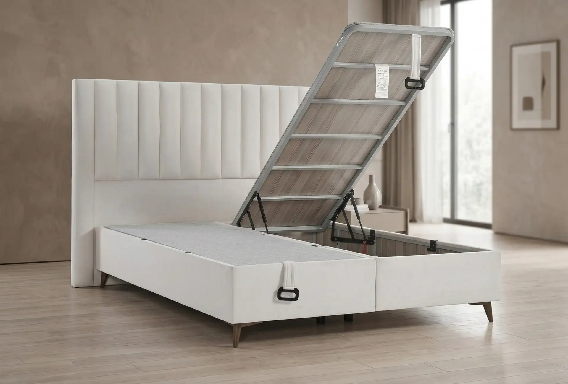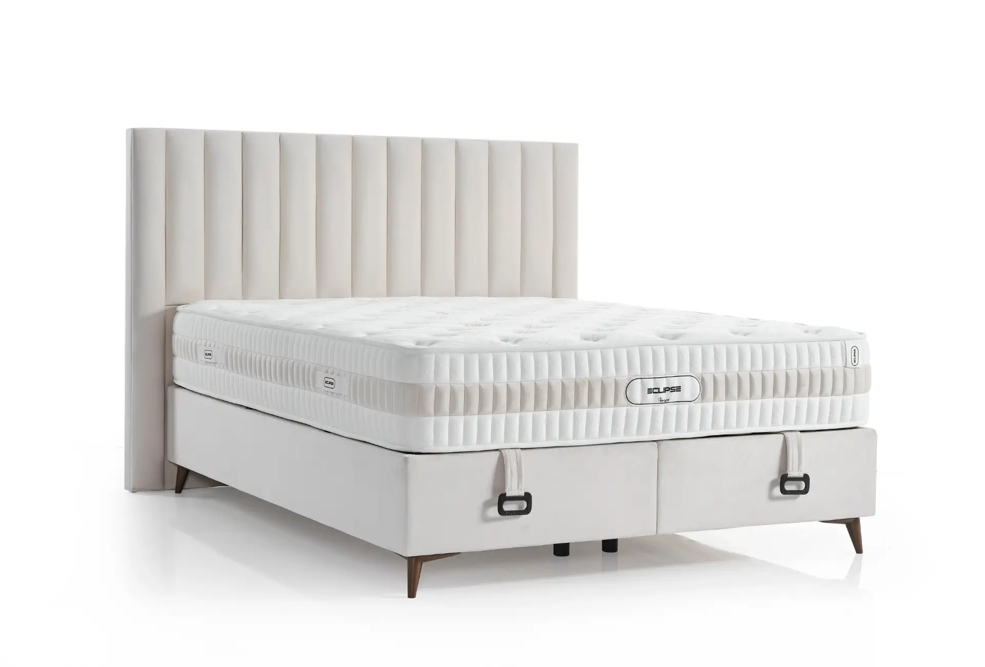 Modern çizgilerin ön plana çıktığı tasarımını, ergonomik bazası ve komodin setleriyle tamamlar. Eclipse, yumuşak dokulu kumaşı ve ahşap görünümlü ayakları ile yatak odanızın havasını değiştirecek.